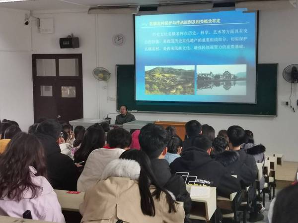首先,万教授阐述了名镇名村保护与传承原则及相关概念的界定,让同学们明白保护名镇名村的重要性,有利于增强民族凝聚力。其次,万教授对名镇名村保护范围划定与保护措施制定做出了详细的讲解,提出保护名镇名村应遵循的几项原则,要确保其真实性和完整性,增强公民参与度。另外,还要应正确处理历史文化遗产保护、社会经济发展与人居环境改善之间的关系,展示和弘扬优秀传统文化,保护物质文化遗产与非物质文化遗产及其依存的空间与环境,将有保护价值的景观环境纳入保护范围,并制定相应的保护措施以促进历史文化名镇名村与环境协调发展。然后,万教授为同学们介绍了传统建筑的保护措施与功能提升的具体方案。最后,万教授对名镇名村基础设施完善与防灾进行了具体的诠释,主要从原则、措施及工程管线设施建设方面讲解,提出历史文化名镇名村和传统建筑应评价其自然灾害与灭失风险,防御与减轻突发灾害造成的危害和损失。还应充分利用传统的给、排水设施,作为给、排水系统的有机组成部分,防止造成对文化遗产的损失。