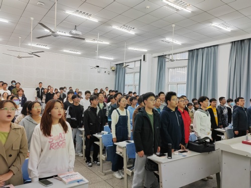 活动伊始,全体参会人员起立,奏唱国歌。在热血与情怀交融沸腾的气氛下,高明顿学长开始了他的分享,“铸剑”“淬火”,高明顿这样描述自己的从军经历,为服从兵役主动放弃诱人的职位,投身于蔚蓝的大海;为抢救火灾付出鲜为人知的代价,只因身着军装,肩负责任。高明顿的感人事迹牵动着同学们的心,让同学们再一次感受到了中国军人的无私和伟大。“退伍不褪色”,梁彬这样形容自己的军旅生活,抗洪一线,用身躯为人民挡住汹涌的是中国军人;面对暴徒,不顾危险冲在最前的是中国军人。他们牺牲小我,让祖国放心,让人民放心。“投身国防,从未后悔;复学虽苦,从未后悔”,梁彬用切身行动成为同学们的军人榜样。一张张荣誉照片满载着新兵连的回忆,曹甲阳用问题审视自己的军旅生涯,用回答交付初心和使命。热血诠释了青春,行动坚守了誓言,带着从军营磨砺出的成长,光荣退伍复学。曹甲阳满怀信念,积极投身于生活,优异的成绩激励了在场的每一位同学。“人生最美是军旅,辉煌而又难忘”,吴星以俯卧撑为例,讲述了军营里的酸甜苦辣。与时间赛跑,同台风竞速,身为武警的吴星,用实际行动诠释着军人的意义和使命。“心系国防,有你有我”吴星的分享,让同学们深刻体会到了国防建设的来之不易。