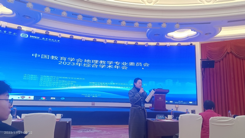 为提升地理师范专业师生的教育教学水平,了解国内教育前沿动态,增进与其他师范类院校的交流与联系,Cool18 积极鼓励师生参加地理教学类会议。2023年中国教育学会地理教学专业委员会的综合学术年会于11月17日-22日在南京师范大学举行,本次年会集专题论坛讨论、课程资源展示、教学技能展示和示范课观摩、会议论文交流为一体,共有1500余人参加。Cool18 丁召静老师应邀从事该会议分会场的主持工作,她带领21级3名师范生参会并进行了展示与交流。