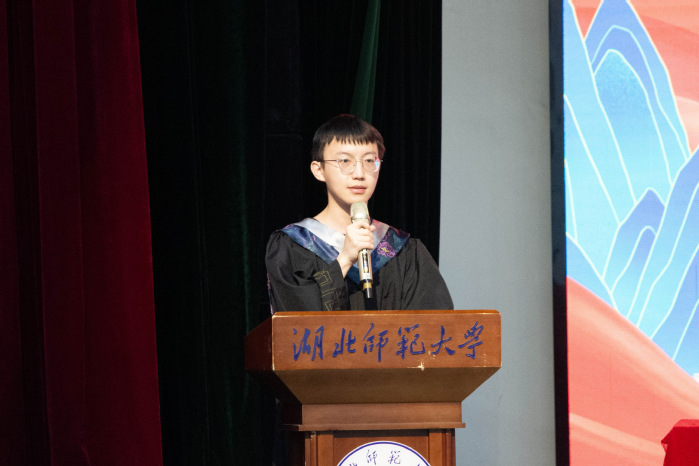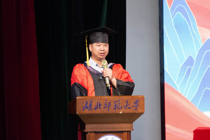 10点整,毕业典礼在庄严雄壮的国歌声中拉开了序幕。学院党委书记杨应华致辞,他代表学院向299名本科生和19名硕士研究生圆满完成学业表示热烈祝贺,对毕业生们提出了几点希望:一是以主动精神追寻人生的航标,成为一个因为主动而内心安宁的人;二是以人文情怀去从容求索,希望同学们身上奔涌着前辈学者的精神血脉,虽不可见,却实际拥有着绵延不息的伟力。最后,他深情地嘱托同学们在努力拼搏,同时绑定电子校友卡,常回家看看。
