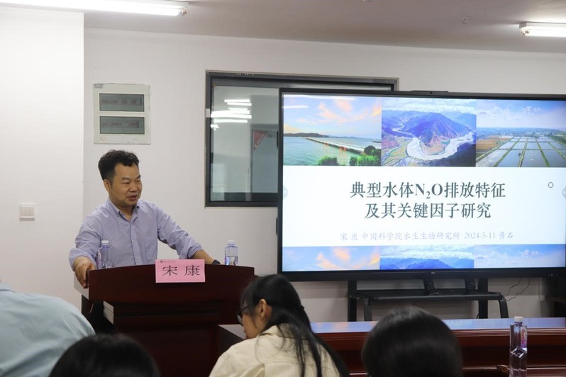 宋康研究员从研究背景、湖泊营养级对N2O排放影响与作用机制、湖泊悬浮颗粒物对N2O排放的影响及微生物作用机制解析、典型生物膜界面N2O排放的机理和N2O还原微生物研究等五个方面进行了介绍。报告中,宋康研究员还就水体N2O前沿研究领域与师生进行了深入交流。