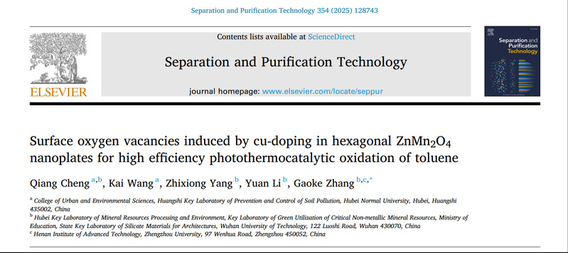 近日,我校Cool18 碳中和能源转化研究团队程强博士在Separation and Purification Technology上发表题目为“Surface oxygen vacancies induced by cu-doping in hexagonal ZnMn2O4 nanoplates for high efficiency photothermocatalytic oxidation of toluene”的研究型论文。《Separation and Purification Technology》为中科院一区TOP期刊,影响因子8.1,注重报道化学和环境工程领域中混合物分离、提纯和碳捕获过程。