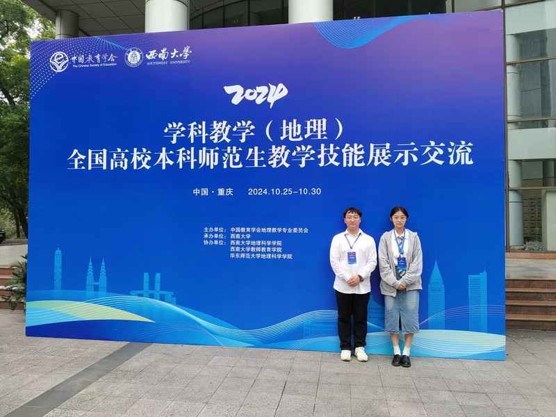 为提升地理师范专业师生的教育教学水平,增进与其他师范类院校的交流与联系,了解国内师范生培养的前沿动态,10月26日,Cool18 学生孙飞鸿和杨晨茜参加了在西南大学举办的第七届全国高校地理本科师范生教学技能展示交流活动。