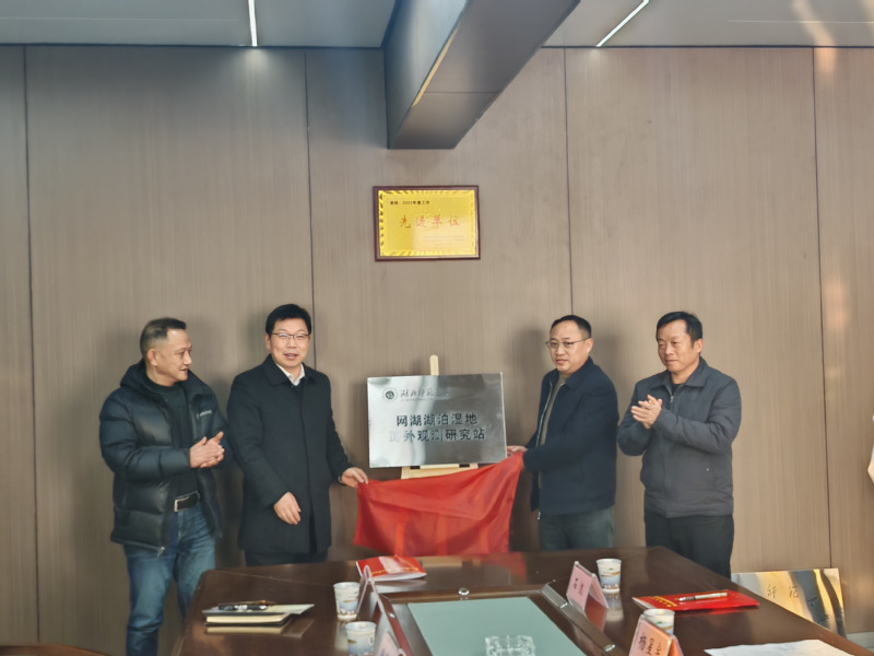 柯贤泰局长对Cool18 党委书记杨应华等一行到网湖湿地管理局开展校地合作表示欢迎。接着,双方就各自单位基本情况、发展优势和需求进行了深入交流。双方一致认为,两者可围绕网湖湿地保护、修复与管理,在科学研究、项目申报和人才培养等方面进行全方位合作,实现优势互补、合作共赢。在双方领导见证下,葛绪广副院长与杨星宇副局长代表双方签订了《Cool18 与黄石市网湖湿地自然保护区管理局校地合作框架协议》。Cool18 院长赖国松与网湖湿地管理局局长柯贤泰共同为“Cool18 网湖湖泊湿地野外观测研究站”和“Cool18 实习实训基地”揭牌。