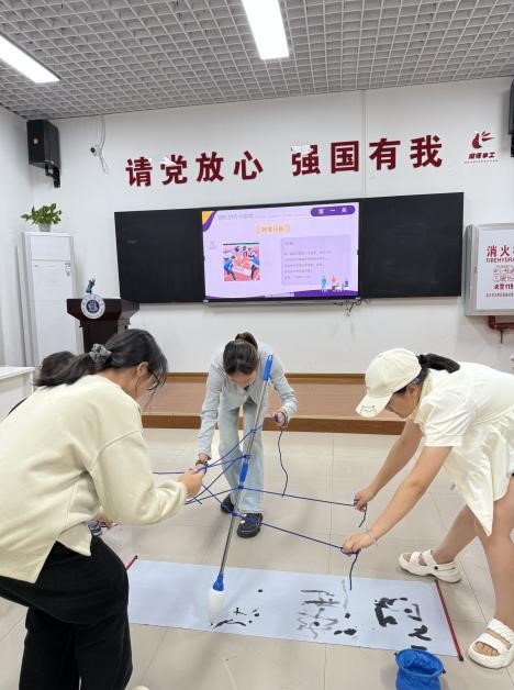 笔墨凝心,共绘愿景。首项活动“神笔马良”率先点燃团队热情。队员们需协同操控系满绳索的巨型毛笔,在宣纸上书写“自律”二字。随着最后一笔完成,宿管部李晨瑜动情表示:“就像这支笔——看似各自用力,实则始终同心同行。这让我想起过去组织活动的点点滴滴。”