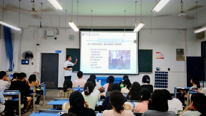 在介绍课程体系时,陈龑结合多媒体课件,展示了包括地理信息系统(GIS)、遥感技术与应用、环境监测与评估、区域分析与规划等专业核心课程的教学内容与应用实例。他还通过大量往届学生野外实习、地理测绘实践、科创项目研究等现场图片,生动再现了地理专业强调动手能力和实地解决现实问题的教学特色。实验室的高精度无人机、三维激光扫描仪、遥感图像处理平台等先进设备也首次以影像形式向新生亮相,引来阵阵赞叹。